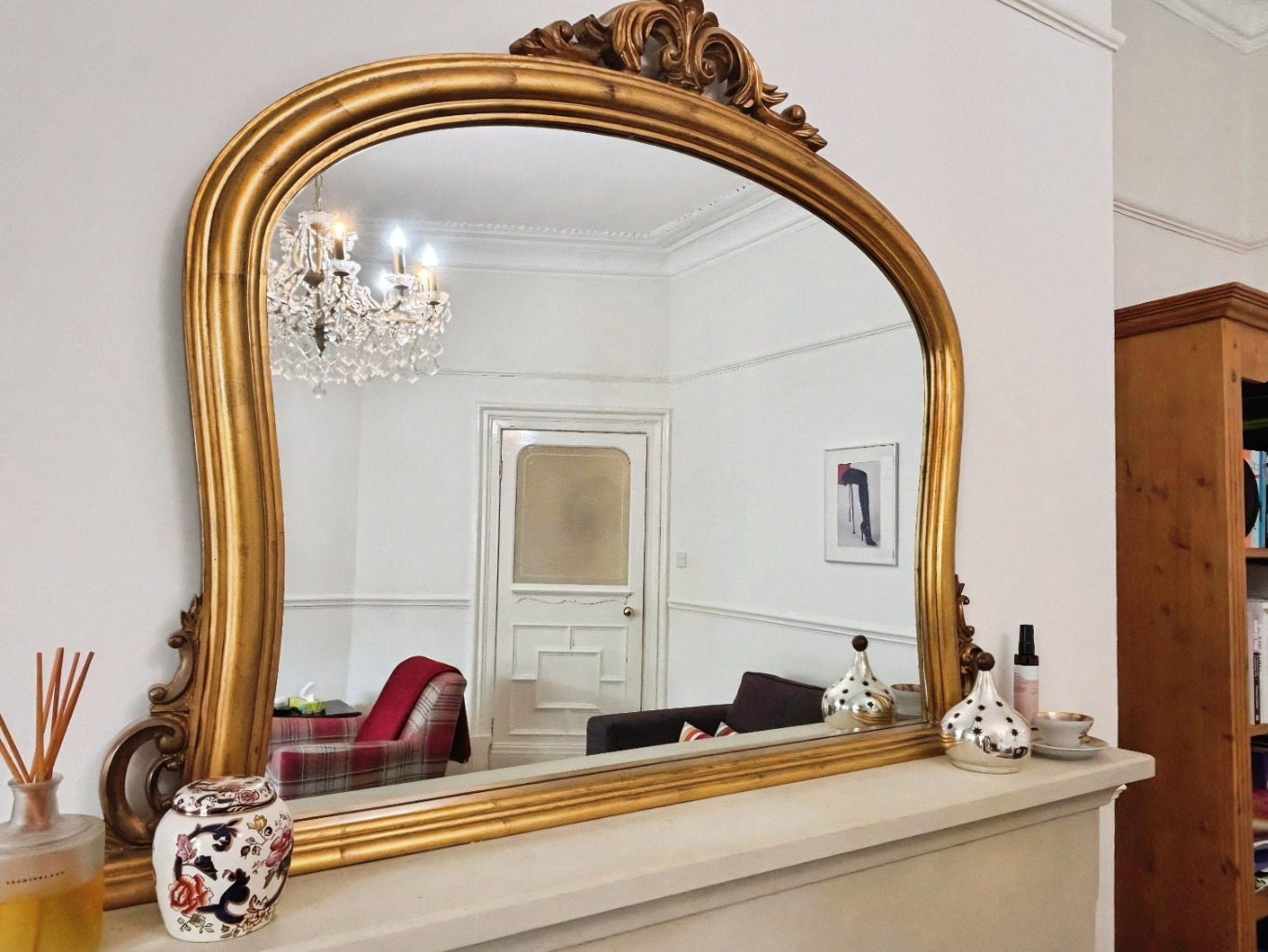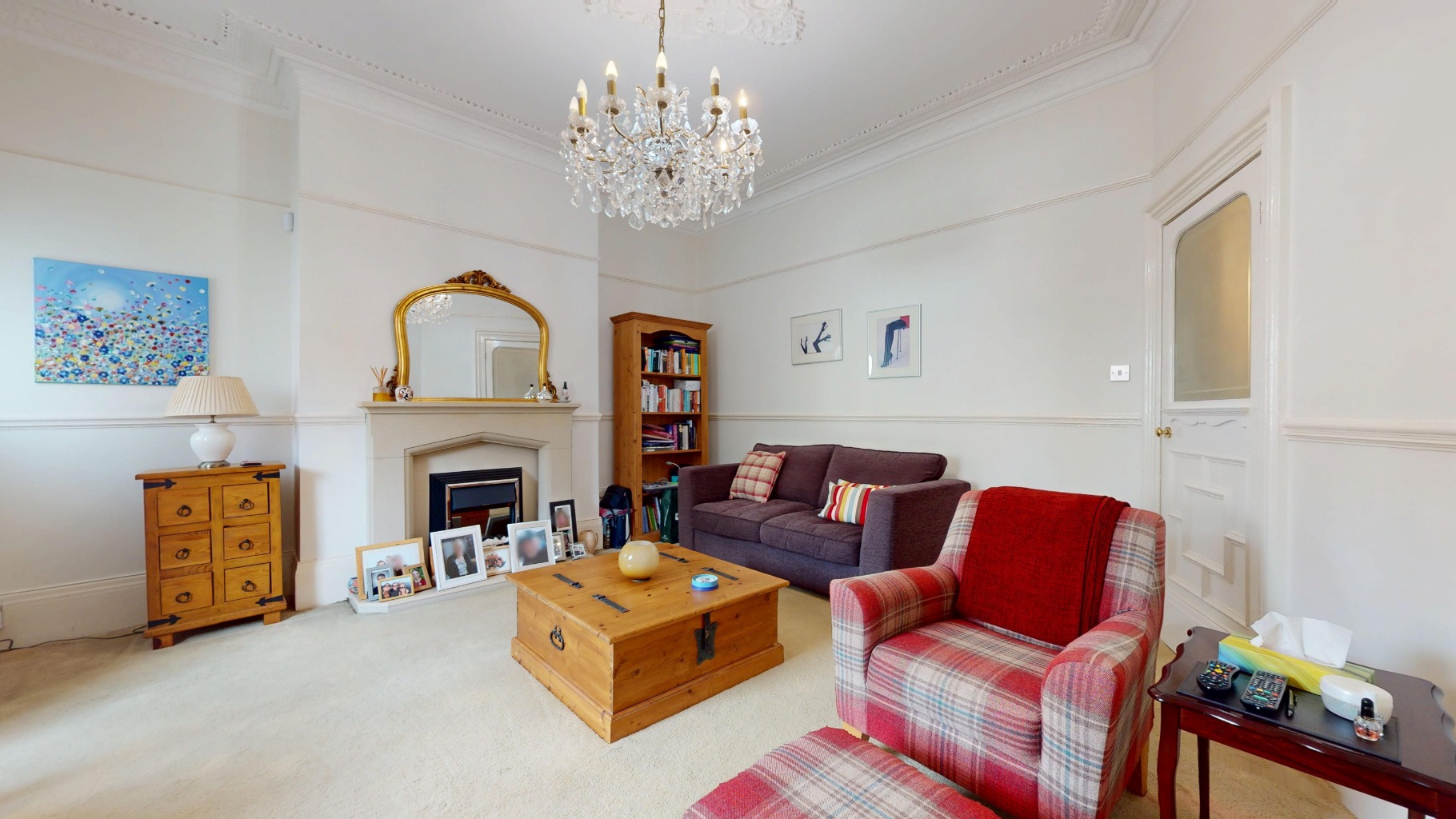The spacious living room boasts high ceilings, a classic ceiling rose, and picture rails, creating an elegant period feel. The room features an electric fire with surround and plush beige carpeting, making it a warm and inviting space. There is ample room for a small dining table, with a front-facing window allowing natural light and views over the street. A large chandelier could easily become the focal point of the room, highlighting its characterful interior.