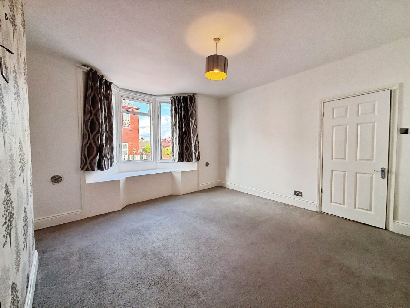 The property benefits from a spacious and welcoming front bedroom, enhanced by a large bay window allowing for plenty of natural light. Currently used as a comfortable double bedroom, this room features modern grey carpets, a stylish wallpaper feature wall, and attractive alcoves to either side, adding both character and practicality.