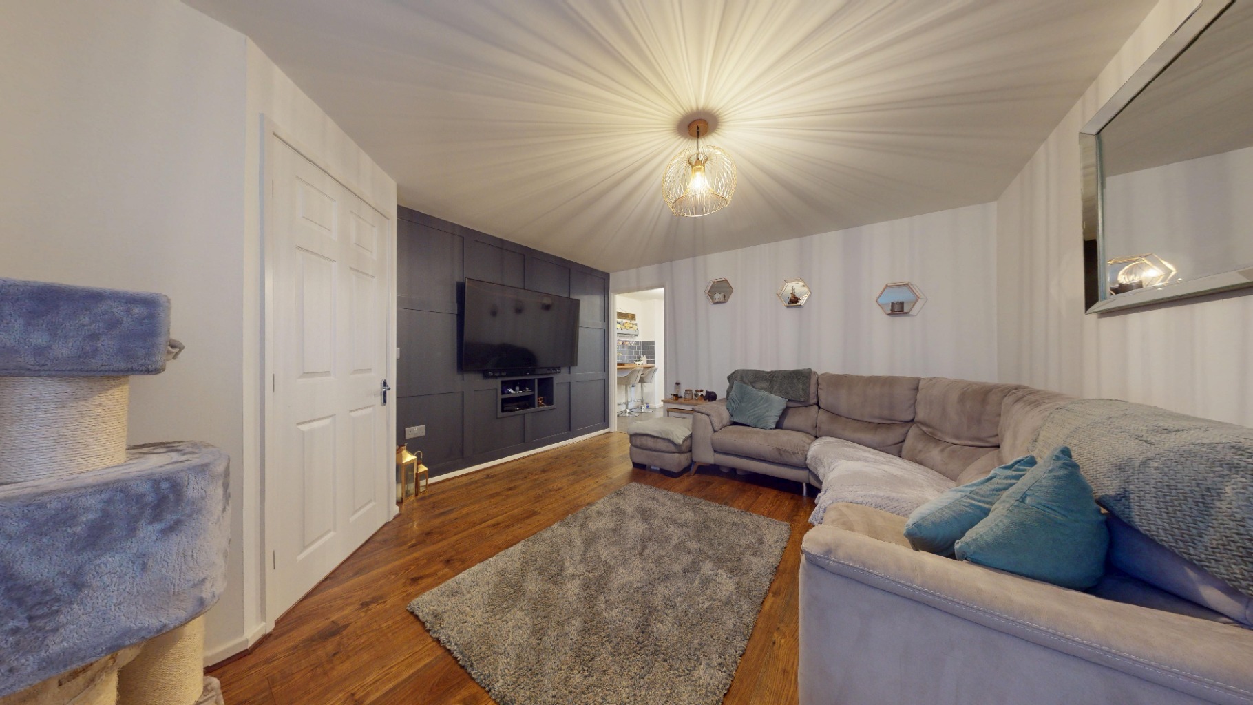 The sitting room is a fantastic size and feels bright and inviting. It’s neutrally decorated with dark wood-effect flooring, giving the space a modern yet homely feel. The current layout comfortably fits a large L-shaped sofa while still offering plenty of room to move around — perfect for relaxing evenings or hosting guests.