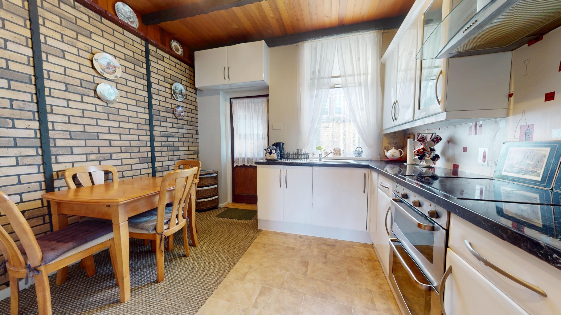 Kitchen with white fitted units and space for a dining table