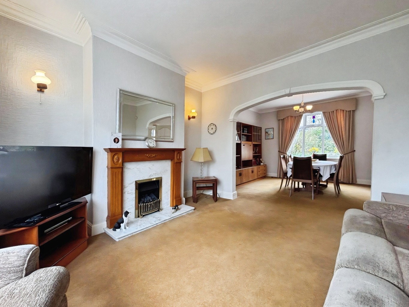 To the left, you’ll find a substantial open-plan living and dining area, offering a versatile space for both relaxing and entertaining. This room presents an excellent opportunity for further enhancement, whether by adding double doors for separation or reconfiguring the layout to open through to the kitchen and potentially extending.