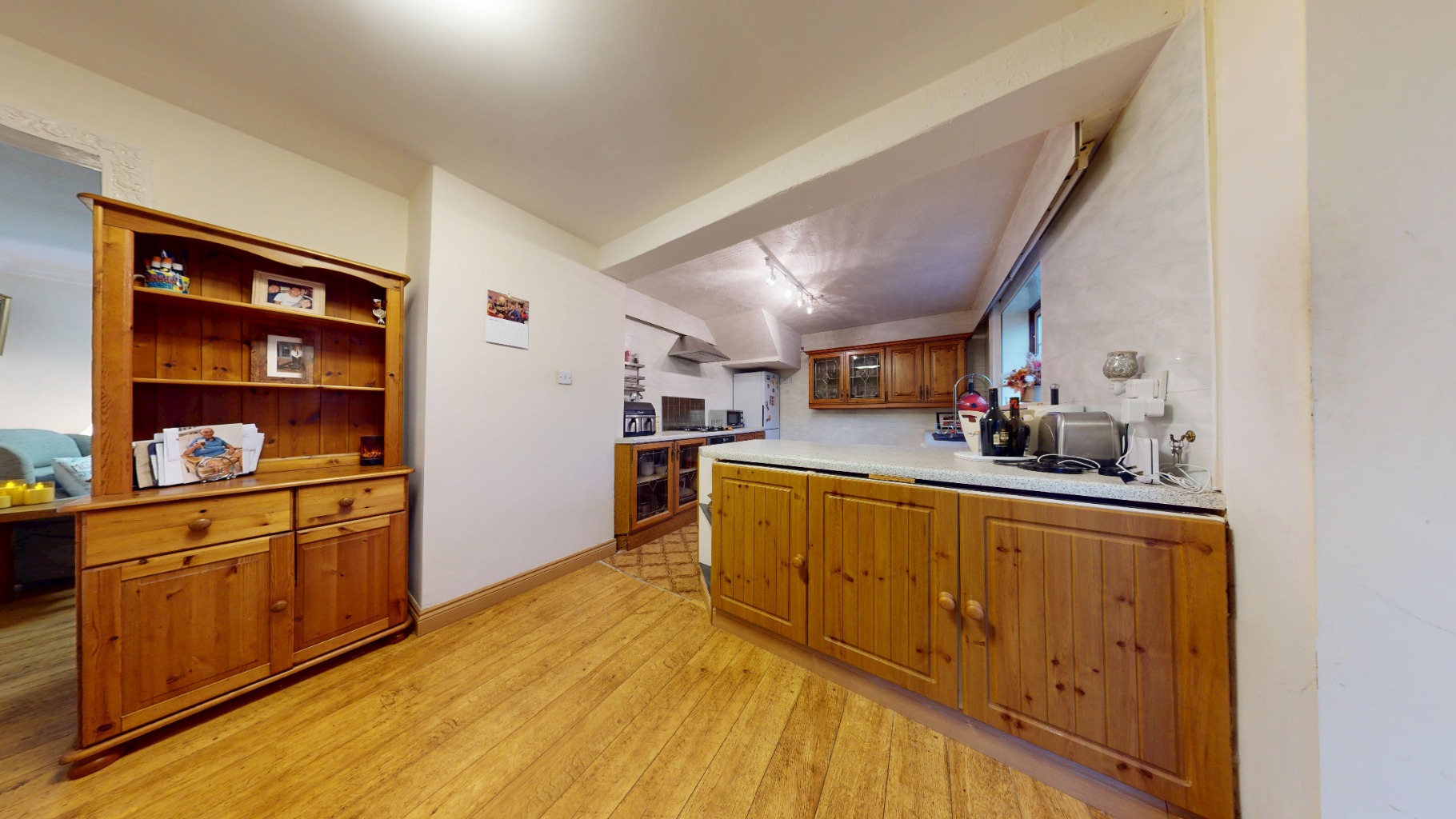 Flowing through the property is the open-plan kitchen and dining area, a versatile space with gas hob, oven, extractor, and sink, plus space and plumbing for a washer/dryer. This room presents a fantastic opportunity for the new owners to put their own stamp on the layout and design. Hardwood flooring and neutral décor run throughout, maintaining a consistent feel across the ground floor.