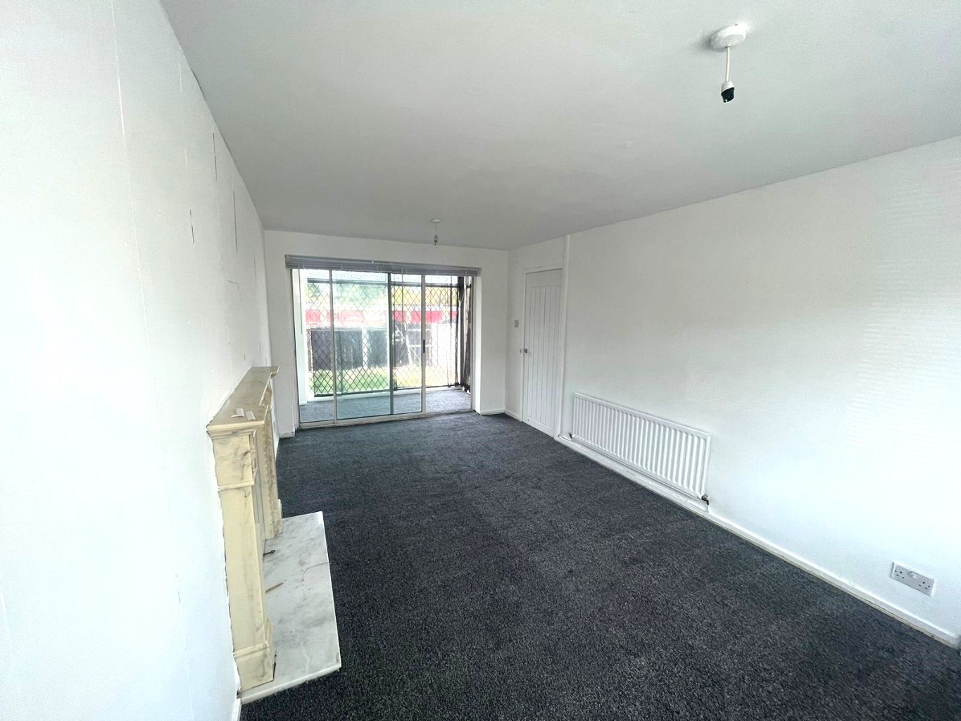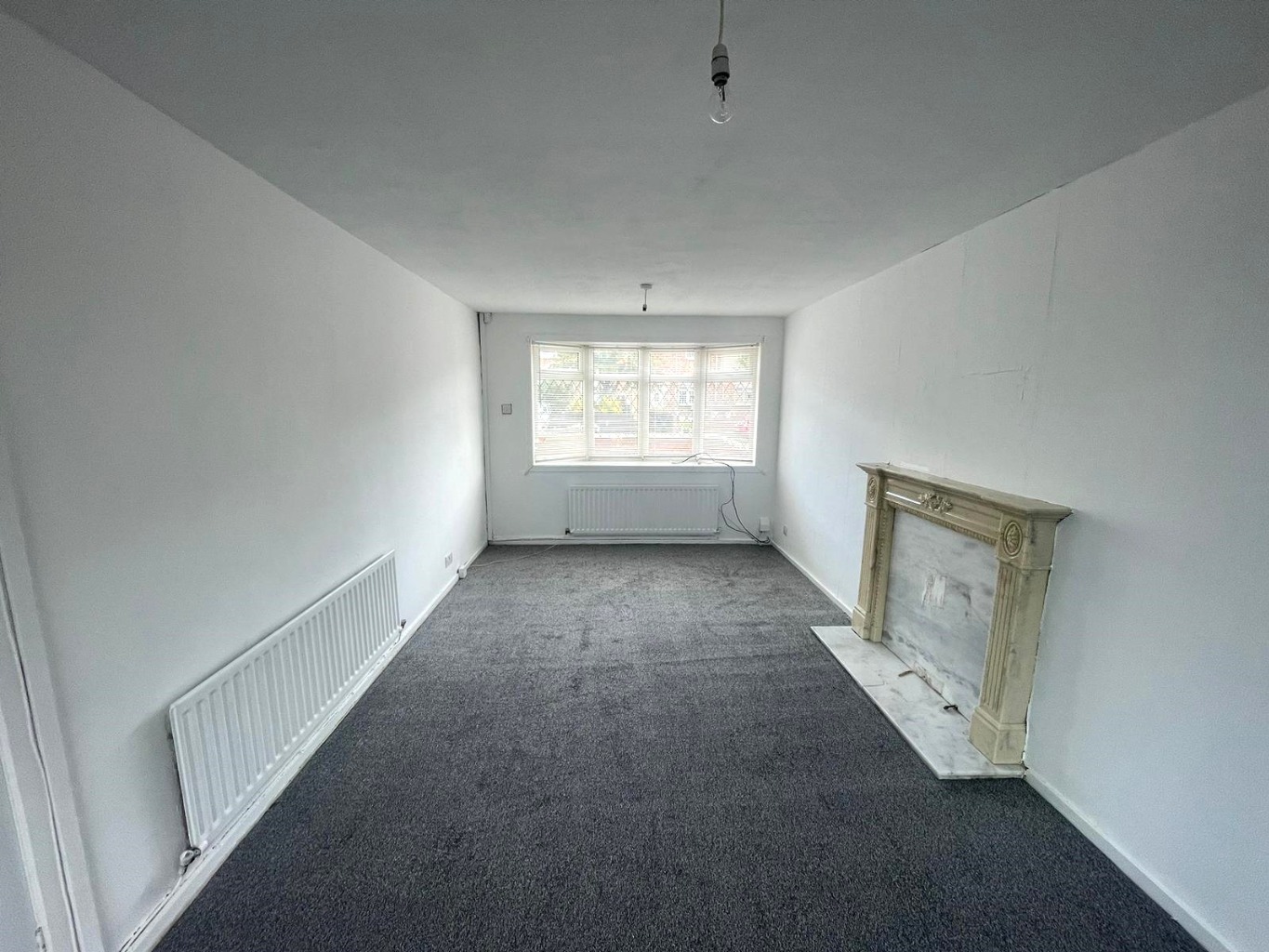 This beautiful home has a sitting room with a bay window that allows for plenty of natural light. The white walls and new grey carpet create a modern and fresh look, while the marble fireplace surround is a beautiful and classic touch.