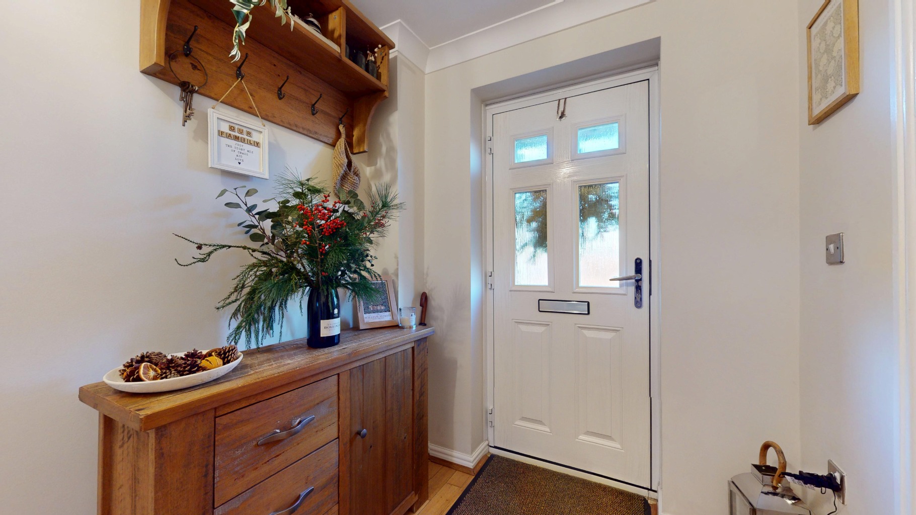 Inside, the inviting hallway radiates cottage charm with solid oak flooring, wool carpeting, and a solid oak cabinet that enhances the warm, homely feel. Throughout the home, solid oak internal doors continue the theme of quality craftsmanship and timeless style.