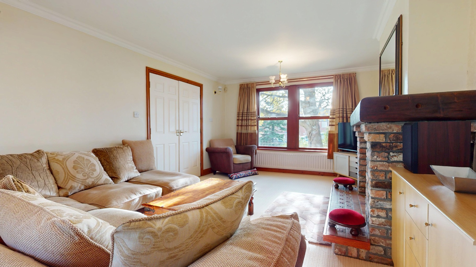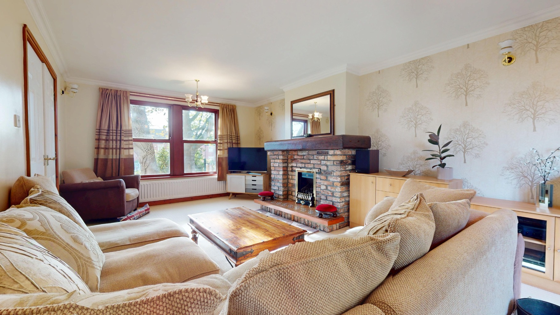 To the left, the main living room exudes warmth and character with its bare brick fireplace, cream carpeting, and a large window overlooking the village and French doors to the enclosed garden. This superbly sized room offers ample space for family gatherings and cosy evenings in.
