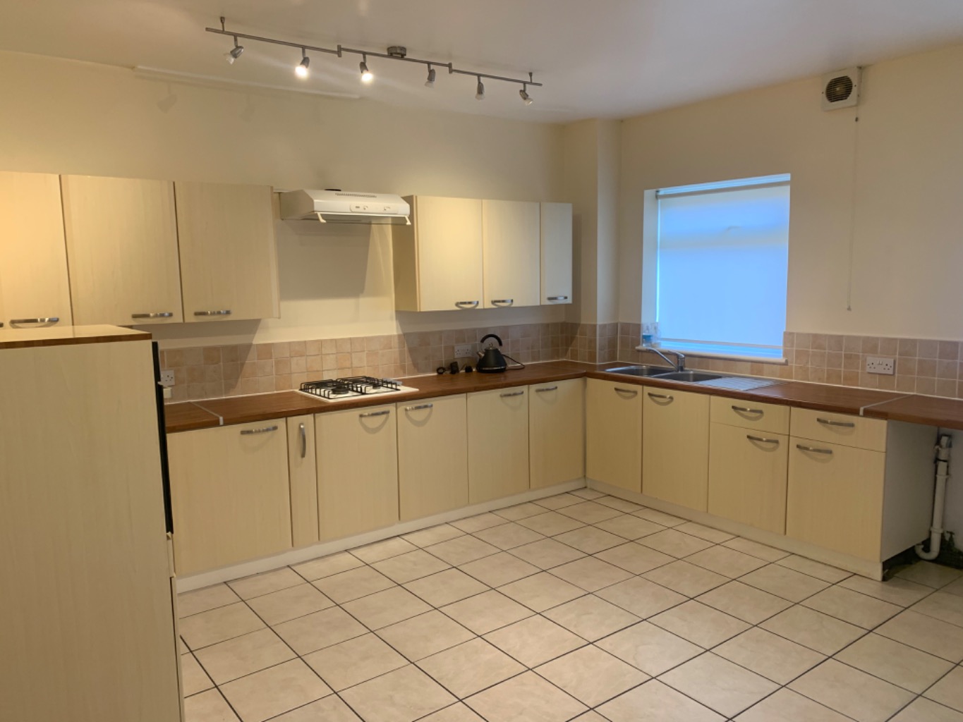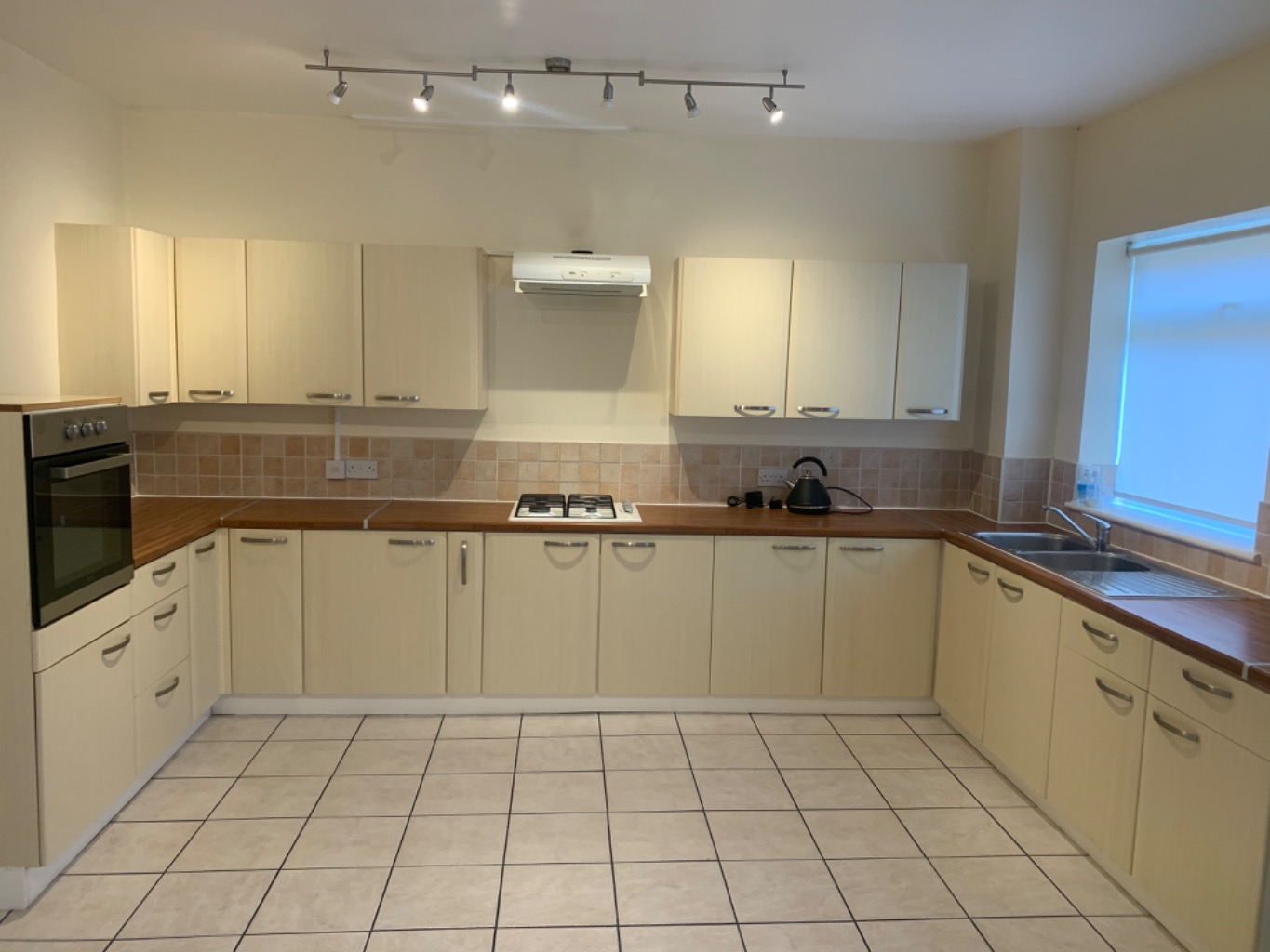 The large kitchen is fully equipped with an integrated oven, providing plenty of space for cooking and dining, making it the perfect space to host dinner parties with family and friends.