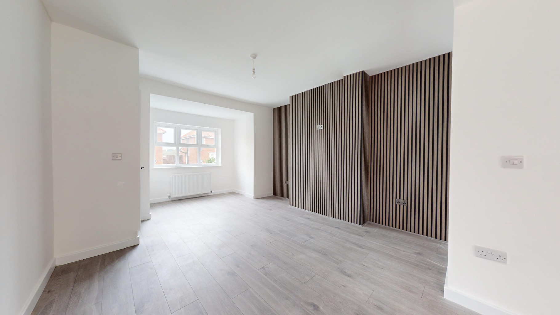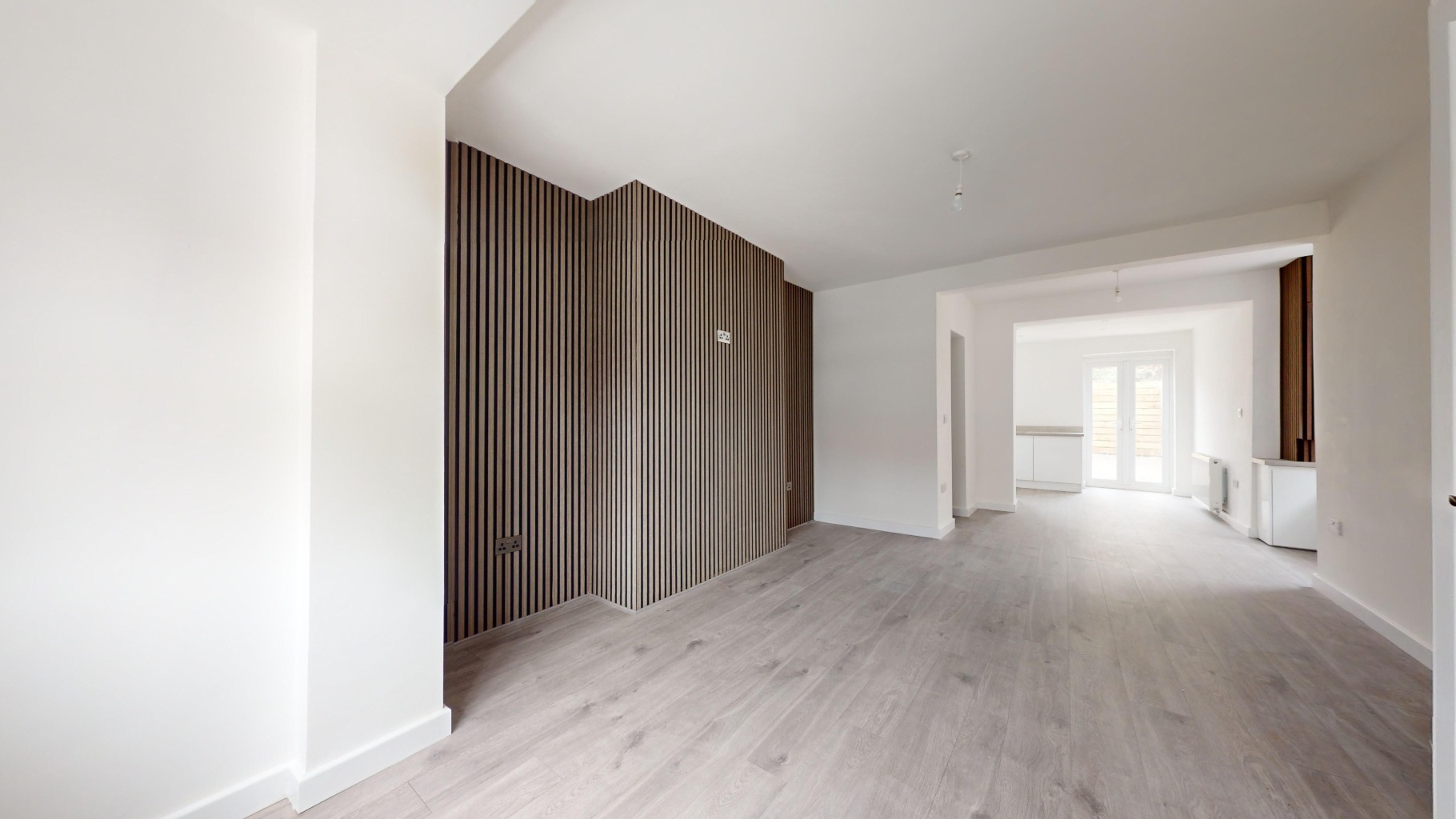 Upon entering, you’re greeted with a practical space on the left for coats and shoes, with stairs directly ahead leading to the first floor. The living, dining, and kitchen areas are open-plan, creating a spacious flow throughout. The living room features a stylish media wall with vertical wood-like panels, which have also been used to cleverly integrate the boiler housing.