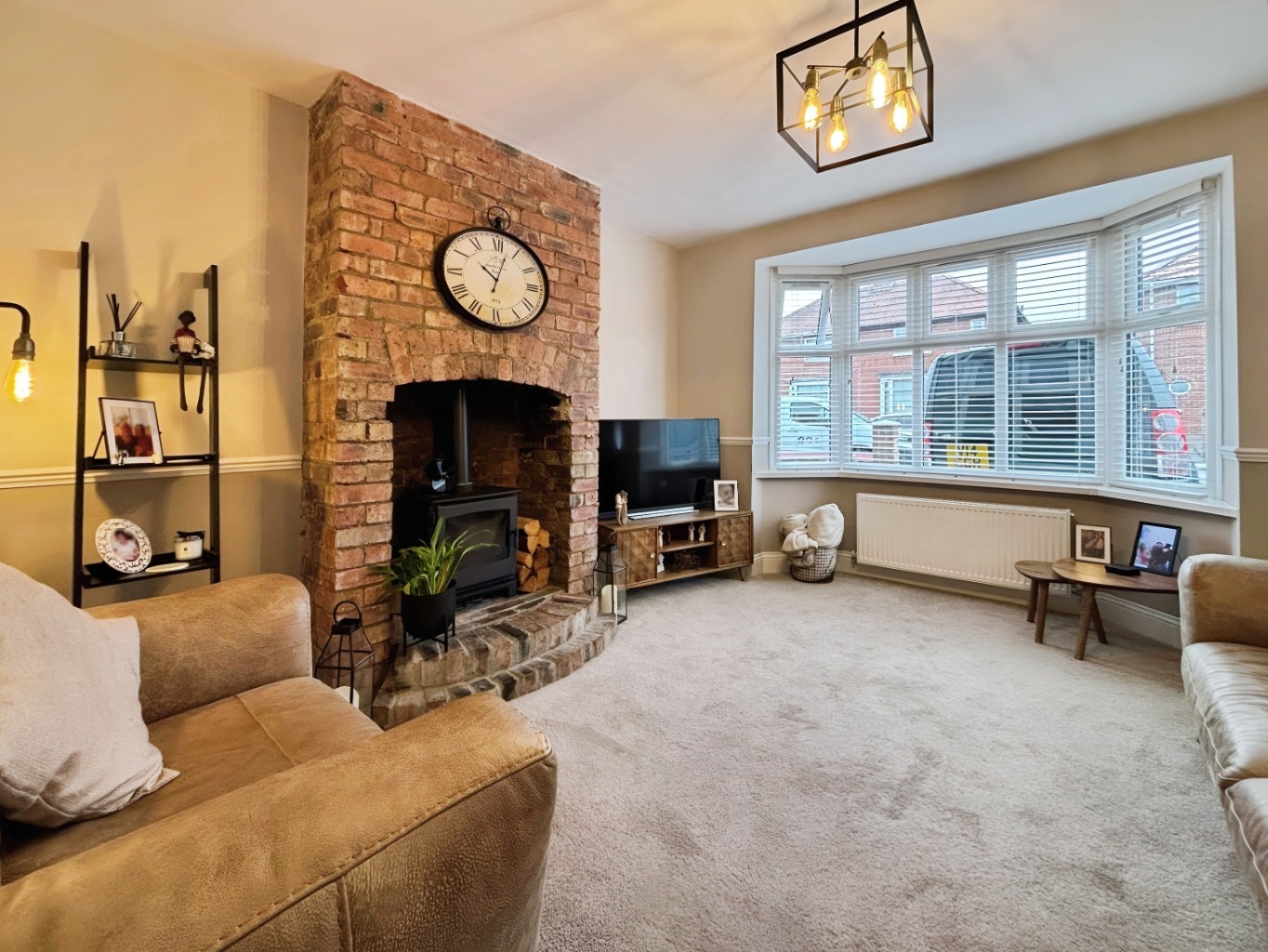 To the front, the cosy living room is filled with natural light from a large window overlooking the street. The feature bare brick wall and new log burner create both texture and atmosphere, while a stylish dado rail adds a modern-meets-traditional twist. A cleverly designed hidden storage space is tucked into the corner, keeping the room practical as well as elegant.