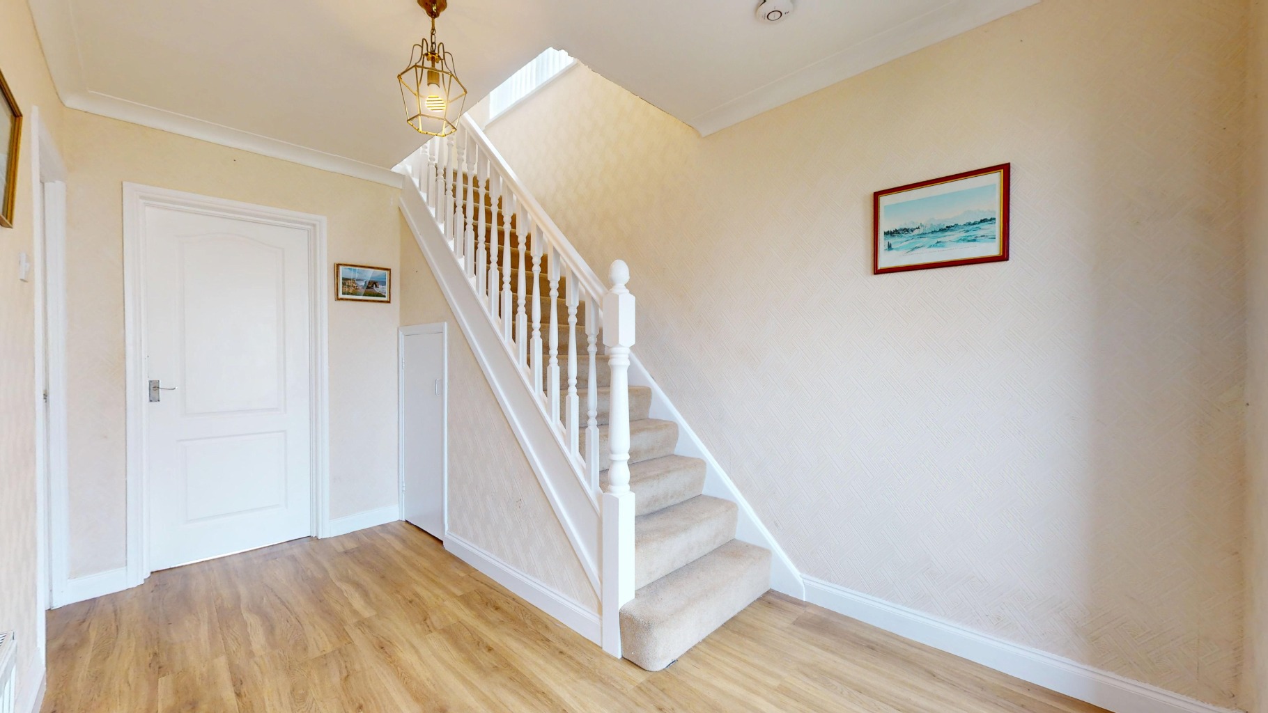 Spacious hallway with laminate flooring and elegant spindle banister
