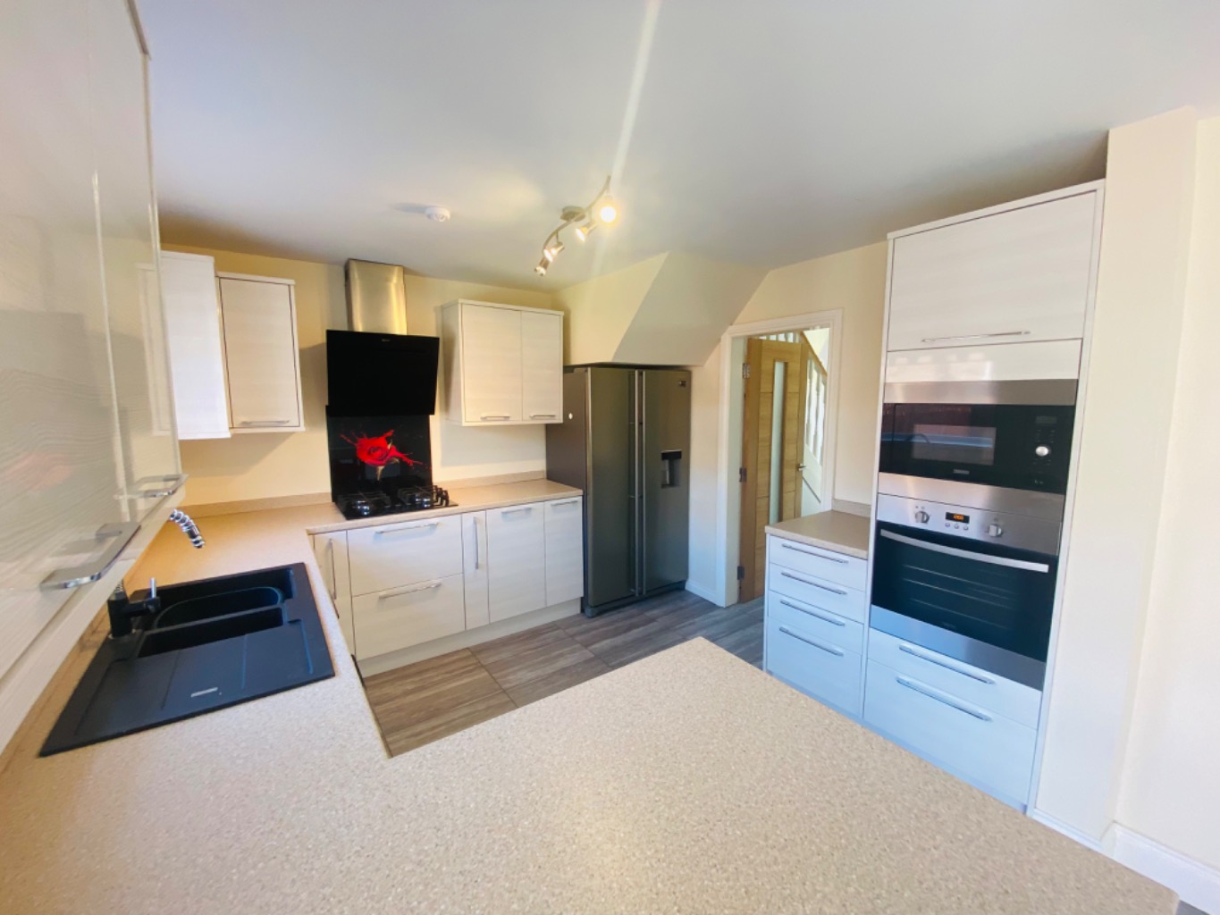 The kitchen is a neutral colour and has a modern, contemporary feel with a black sink and American style fridge freezer completing its look.