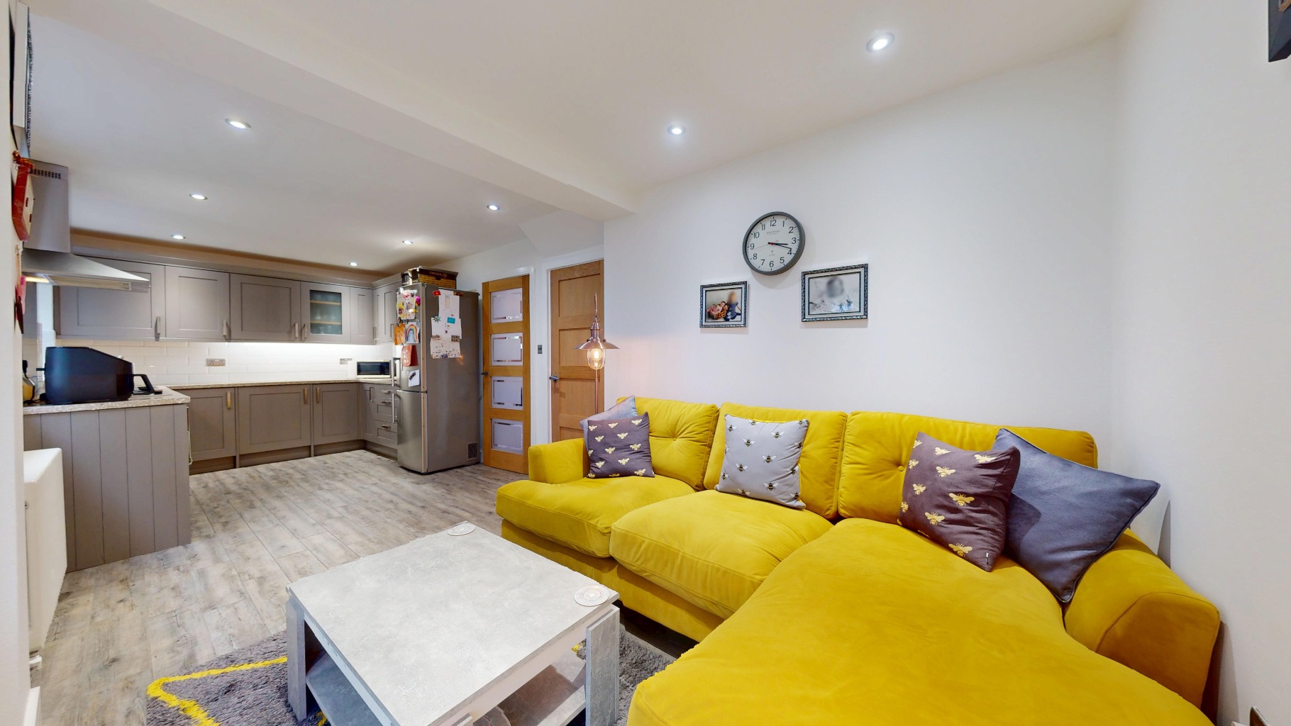 The kitchen spans the full width of the property and includes a versatile seating area that could function as a snug or dining space. Fitted with stylish grey shaker units, the kitchen features silver accents in the handles, backsplash, and extractor. Granite countertops provide a high-end finish, while all appliances are integrated for a sleek look. The fridge freezer can be included in the sale. Grey tiled flooring adds a modern touch, and the recently replaced windows enhance light and energy efficiency. French doors open onto the back garden, creating an ideal indoor-outdoor flow for entertaining or family activities.