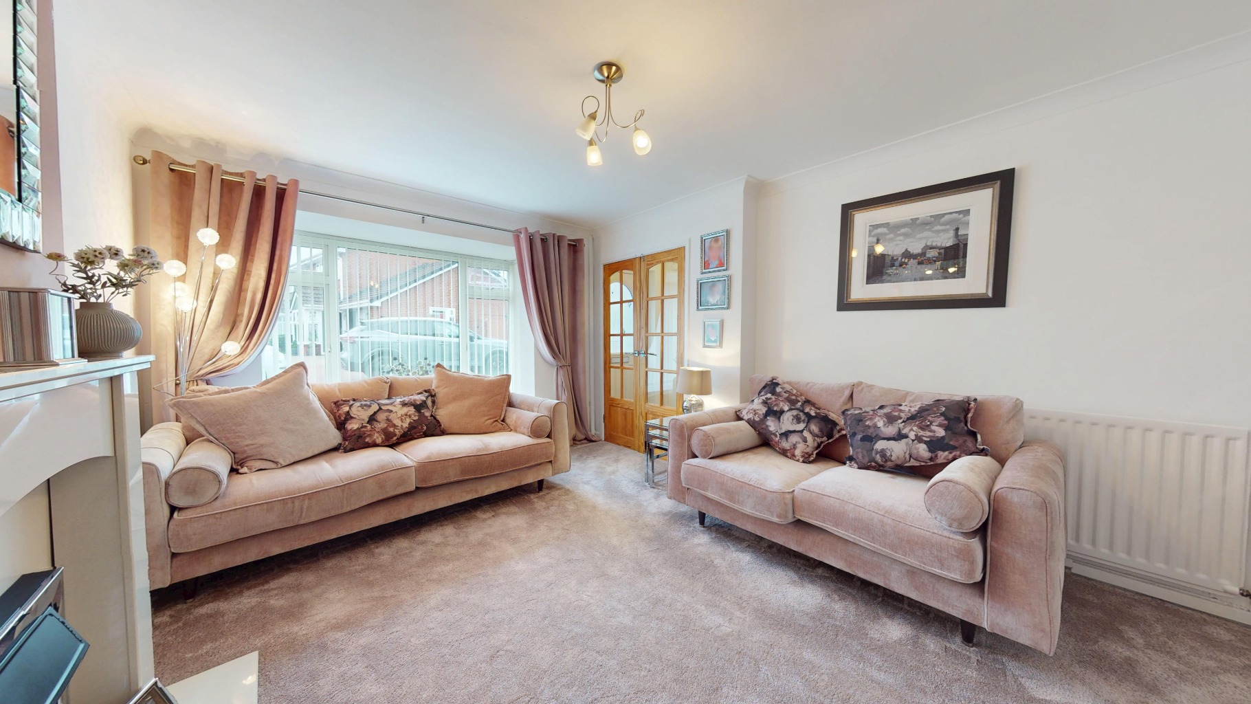Upon entering, you are greeted by a spacious living room with a new carpet, a large window flooding the space with natural light, and a central electric fire with an elegant surround. Double wooden doors lead from the passage into this inviting room, while oak doors throughout the home add a touch of sophistication and continuity. This living area flows seamlessly into the kitchen, creating a connected and versatile living space.