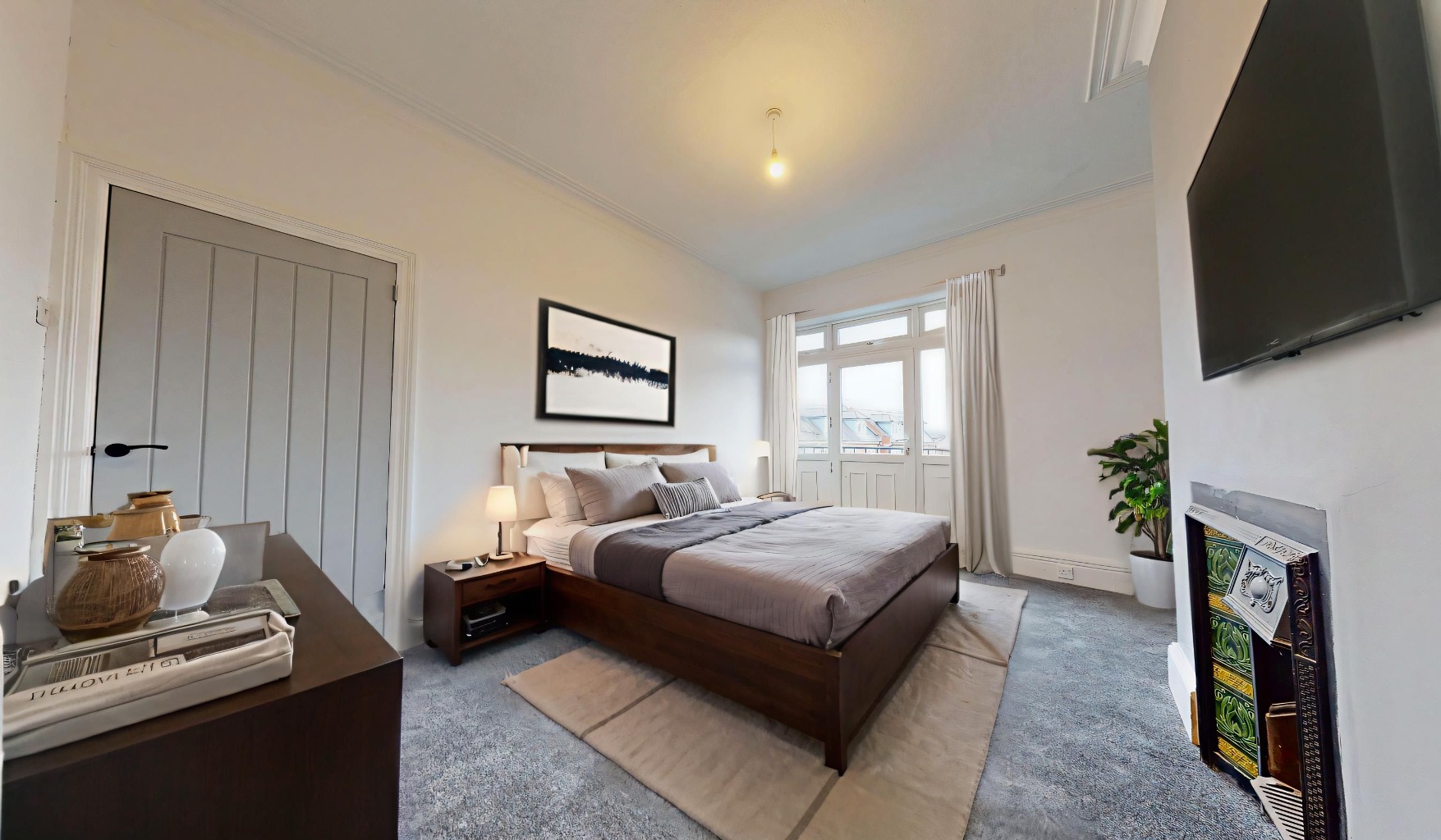 Upstairs, the property continues to impress with a well-appointed family bathroom, complete with bath, walk-in shower, wash basin and WC. There are three good-sized bedrooms, two of which are generous doubles with ample space for king-size beds and storage. The primary bedroom benefits from doors leading out onto a balcony area, adding a unique feature to the home. The third bedroom is a spacious single room, ideal as a nursery, home office or guest room. All bedrooms are finished with grey carpets and neutral décor.